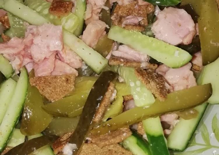 - В салатник положить огурцы, тунец, сухарики (у меня были просто тонкие ржаные хлебцы), налить чуть сока тунца из банки, перемешать.