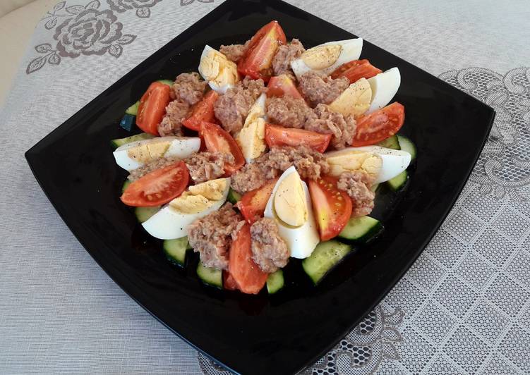 - Открыть баночку тунца и добавить к овощам Красиво выложить на тарелке. Сделать заправку: соль, перец по вкусу+ масло+ уксус или лимонный сок. полить соусом салат.